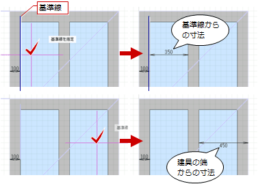 - 寸法を追加すると、基準線が表示されます。2つ目以降の寸法の1点目は基準線、または建具の端になります。