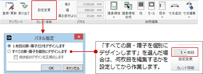 「建具区画」で「引き違い」や「折戸」など、枚数の設定が可能な区画種別を設定した場合は、「設定変更」をクリックして編集の対象を設定します。
