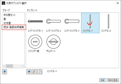 「把手(汎用3D)」を選びます。 - 「汎用オブジェクト選択」ダイアログでグループを選択して、一覧から配置するオブジェクトを選択します。