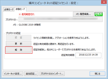 体験版の試用期限が切れたら、ネット認証ライセンスセンターの履歴から体験版のプロダクトIDを削除しておきます。