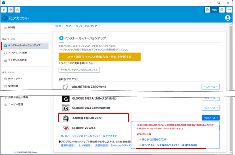 FCアカウントの「インストール・バージョンアップ」に進み、「J-BIM施工図CAD 2022」の「インストール」メニューから 「メディアイメージを保存してインストール」をクリックします。