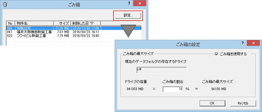 | ごみ箱の最大サイズ | 割り当てるごみ箱の最大の容量です。この最大容量を超える場合、「物件選択」ダイアログで物件データの削除ができなくなります。 |