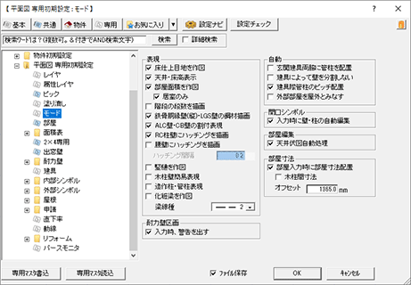 平面図で入力する床仕上目地の作図の有無、天井高・床高や面積の作図の有無、柱壁の自動配置などについて設定します。