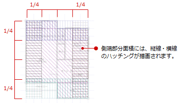 側端部分面積とは、建物の最大領域をX、Y方向に1/4ずつ分割し、両端から1/4までの面積のことです。