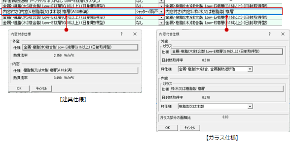 - 内窓の評価方法が「計算式による」の窓は、「内窓付き仕様」ダイアログで二重窓の外窓、内窓の仕様をそれぞれ設定します。