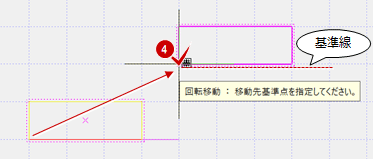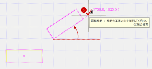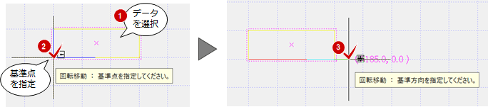 - 回転移動先の仮配置ラインを参照にして、データの移動先基準点と移動先基準方向をクリックします。