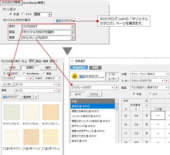 - 素材、部品、建具がオリジナルカタログに登録されていない場合、その建材項目のリストには表示されません。