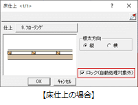 内壁仕上、外壁仕上、壁部分目地、床仕上、床部分目地、内部天井仕上、鉛直天井仕上、ポーチ天井仕上、天井部分目地の属性ダイアログには、「ロック(自動処理対象外)」という設定があります。