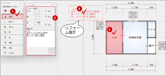 | リフォーム編集+指示 | リフォーム後の仕上の仕様等を設定します。自動的に、リフォームする箇所として指示されます。 | |||