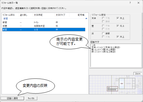 リフォーム指示した箇所を一覧表示します。指示内容を確認・変更することができます。![]() |