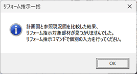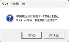 リフォーム | リフォーム一括指示 | 計画図とその参照現況図とを比較して、差異のある箇所(未指示)を列挙し、リフォーム指示情報(新設)を仮配置し、下図ダイアログに表示します。 表示内容を確認し、良ければ「OK」することで、リフォーム指示内容が計画図面内に自動配置されます。 ![]() ※リフォーム計画物件を作成・編集した後に現況図と差異を比較する機能のため、次のメッセージが表示された場合は差異が無い状態です。また、途中で図面を変更した場合も再度実行し直してください。 ![]() ※配置された指示内容は、「リフォーム編集」「リフォーム指示解除」が使用可能です。 ※指示文字タイプは種別により内部固定です。 ※リフォーム指示済、ロックされている部材は対象外です。 ※増改築区画は参照しません。 ※大きい物件は、処理時間がかかる場合があります。 ※対象部材、文字サイズ・色等の設定は、リフォーム専用初期設定を参照してください。 ※次のメッセージが表示された場合は、計画図と参照現況図の関連性が切れている状態です。 「いいえ」後、「参照現況図」を開いて計画図へ戻るか、または参照現況図で「読込」を実行することで関連付けされますので、その後「計画図」に戻り、再度このコマンドを実行してください。 ![]() ※このコマンドは、リノベーションオプションが必要です。リノベ―ジョンオプションを所有していない場合には確認画面が表示されます。 |