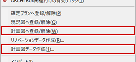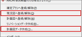 ●既存物件:既存物件を右クリックして表示される計画図関連コマンドから以下を実行します。(→参照)
