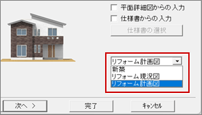 また、リフォームプランに必要な設計図面(計画図面)は、物件選択で計画図データとして指定することで、リフォーム計画作業を進めることもできます。新規作成時に計画図指定するか、既存物件データを計画図指定するか、のいずれかを行います。