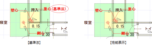 重心は床面積設定の床面積を参照し、剛心、壁心は耐力壁を参照して配置されます。