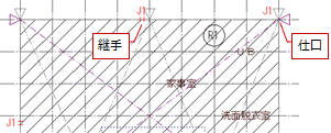 「性能」メニューから「継手・仕口」の「床小屋伏図-継手・仕口読込」を選びます。- 建物外周部の横架材の仕口部分には仕様記号のみ、継手部分には2本線と仕様記号が描画されます。