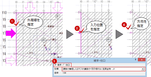 床小屋伏図に入力されている建物外周部の横架材の継手をもとに、継手・仕口を自動配置します。