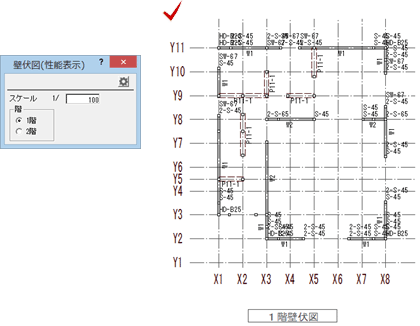 「性能」メニューから「壁伏図(性能表示)」を選びます。 - 「壁伏図(性能表示)」ダイアログで、縮尺と作成する階を設定します。