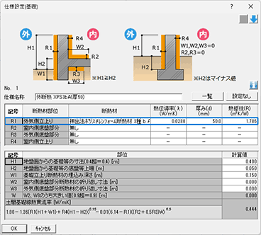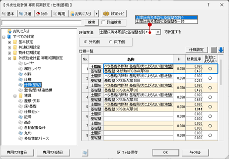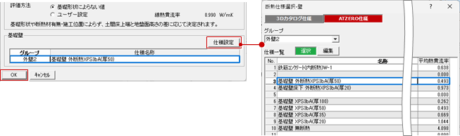 | 基礎壁 | 仕様設定 | 「断熱仕様選択」ダイアログを開いて、基礎壁で使用する壁仕様を選びます。 |