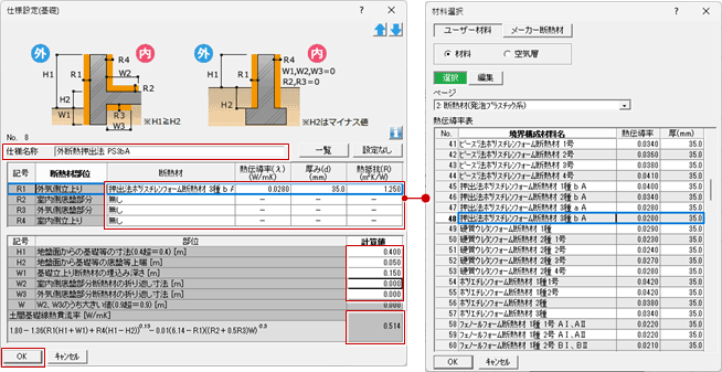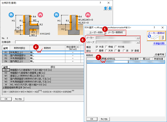- 基礎の各部位で使用する断熱材を、セルをダブルクリックして「材料選択」ダイアログから選びます。