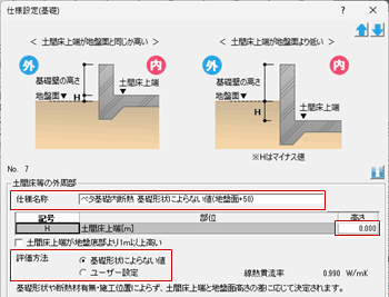「H」の土間床上端の「高さ」を設定し、評価方法から「基礎形状によらない値」または「ユーザー設定」を選択します。