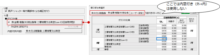 「専用初期設定:建具-建具仕様」の内窓の評価方法によって設定する仕様が異なります。