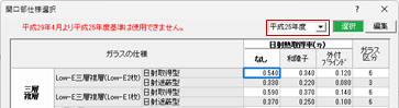 平成25年度基準 平成25年省エネ基準のガラス仕様の一覧を表示します。既存のデータで平成25年度基準のガラス仕様を使用している場合に表示されます。