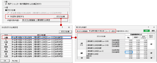ガラスの仕様を選ぶか、方位別にガラスの仕様を設定します。内窓のガラス仕様は内窓の評価方法によって設定する仕様が変わります。