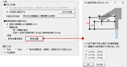 庇下端から窓上端までの垂直距離と壁面から庇先端までの張り出し寸法にする位置を設定するには、「庇等」の「軒先位置」をクリックします。