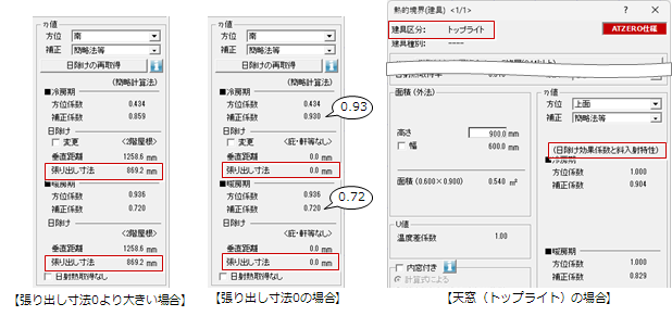 | 庇なし(張り出し寸法0の場合) | 簡略計算法(冷房期:0.93、暖房期:0.72) | |