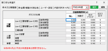 - 平成28年度基準、平成25年度基準で計算した物件データの場合は、「開口部仕様選択」ダイアログに「基準年度」が表示されます。