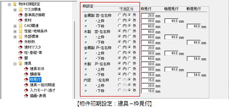- 「物件初期設定-[建具]-[枠見付]の寸法区分より」がONのとき、建具種別毎に上、下、左右の枠に外法・内法を指定できます。