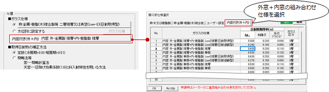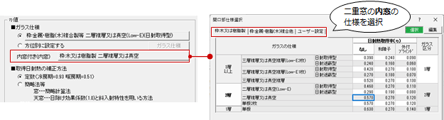 「開口部仕様選択」ダイアログの「内窓付き(外+内)」タブから選択します。