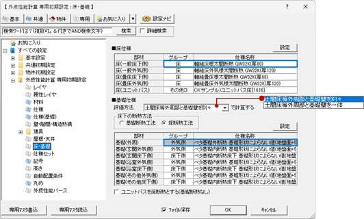 ※「断熱仕様選択」ダイアログには「専用初期設定:仕様(基礎)」で登録した仕様が表示されます。