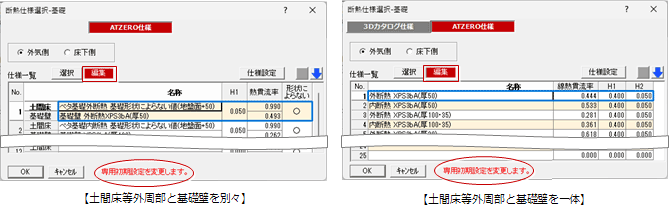 - 「断熱仕様選択」ダイアログで「編集」をONにして仕様を編集すると、「専用初期設定:仕様(基礎)」に登録されている内容も変更されます。