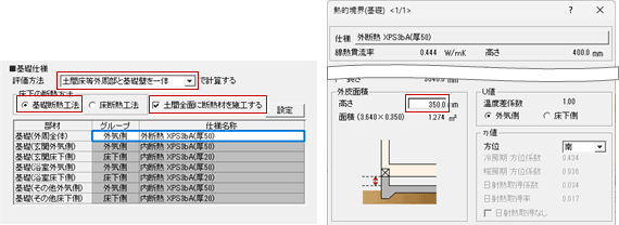 評価方法が「土間床等外周部と基礎壁を一体」で「基礎断熱工法」のときに有効な設定です。