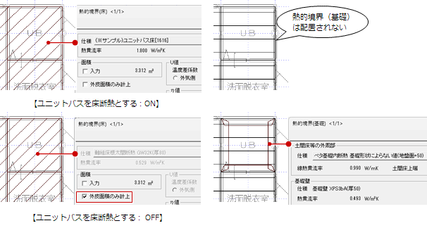 ONのとき、浴室やユニットバスの周囲に熱的境界(基礎)が配置されません。また、床の断熱仕様が入った熱的境界(床)が配置されます。
