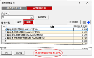 - 「断熱仕様選択」ダイアログの「編集」をONにして仕様を編集すると、「専用初期設定:仕様」に登録されている内容も変更されます。