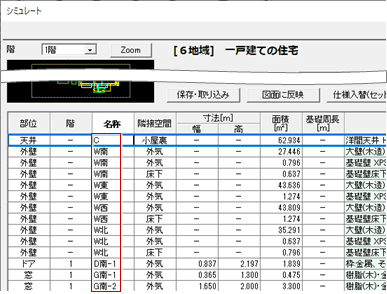 なお、壁、軒桁、胴差、土台、建具(ドア・窓)、構造熱橋H、基礎の熱的境界には、名称に方位が付きます。
