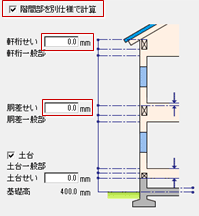 なお、軒桁・胴差・土台のせいを「0」にしている場合は、それぞれ一般部にまとめて計算されます。