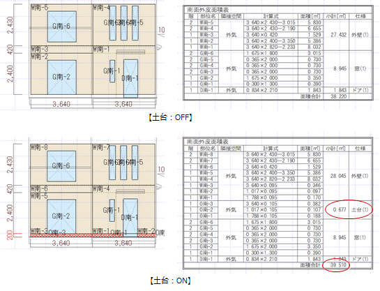 | 土台 | 土台の検討(土台の配置)が不要なときは、「土台」をOFFにします。 基礎断熱のとき、基礎の立ち上がり高が400mmを超えたときなど、土台の検討が必要なときは「土台」をONにして、「土台せい」を設定します。 土台の検討が必要か不要かは、評価機関にご確認ください。 ※ 土台の仕様は、「専用初期設定:壁・階間・構造熱橋」の「階間等」タブの「土台仕様」で設定します。 ![]() ![]() |