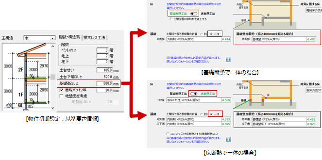 | 基礎高 | 「物件初期設定:基準高さ情報」の「基礎高GL±」で設定した値が連動します。 |
