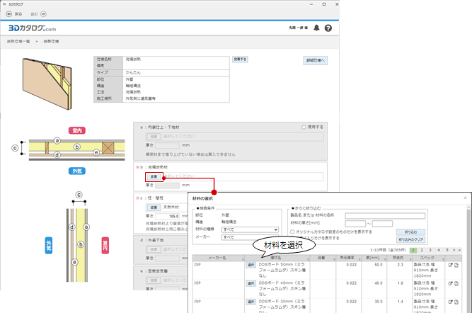 3Dカタログ.comのサイトに登録されている断熱材で断熱仕様を作成します。