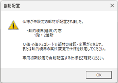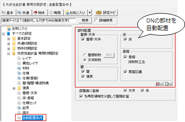 - 「専用初期設定:自動配置条件」の「部材配置」でONの部材が自動配置されます。