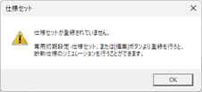 - 「仕様セット読み込み」をクリックしたとき、「専用初期設定:仕様セット」に仕様セットが登録されていない場合、以下のメッセージ画面が表示されます。