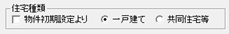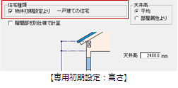 「専用初期設定:高さ」の「住宅種類」の設定が表示されます。![]() 「物件初期設定より」がONの場合は、「物件初期設定:性能・地域条件-建物物事項」の「建て方」の設定を参照します。 物件初期設定よりOFFの場合は、「一戸建て」または「共同住宅等」を選びます。 ![]() |