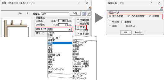 部屋属性の「居室」チェックがONの場合、居室タイプ(主たる居室、その他の居室、非居室)は「部屋タイプ」を参照して自動配置されます。