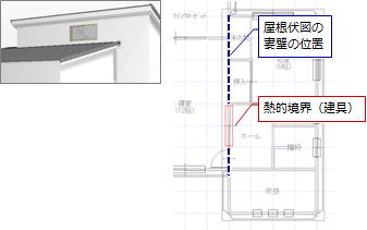 | 屋根伏図の妻壁の位置にある部屋内部の建具(窓) ・ 自動配置条件が屋根断熱・天井断熱にかかわらず、建具(窓)に対して熱的境界(建具)を配置 ![]() |