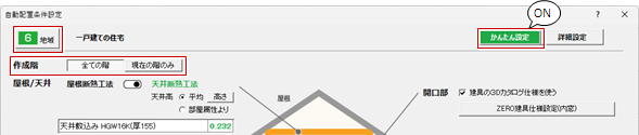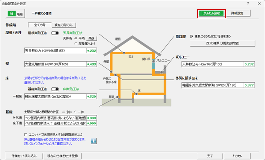 | かんたん設定 | 断熱仕様を指定して、少ない設定で手軽に自動配置を行うモード |