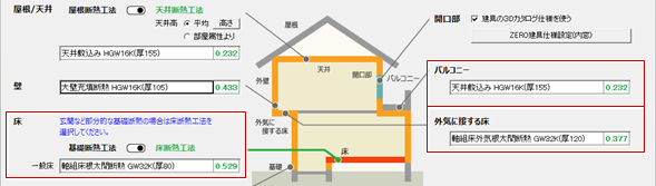 ※ ダイアログの設定項目にマウスを合せると、断熱部分が赤色で表示されます。 - 同様にして、「床」「バルコニー」「外気に接する床」も仕様を確認します。