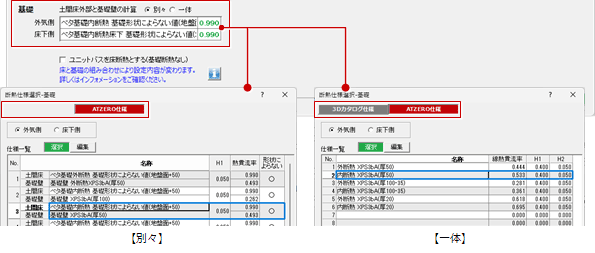 ※「別々」と「一体」によって「断熱仕様選択・基礎」ダイアログの表示が変わります。